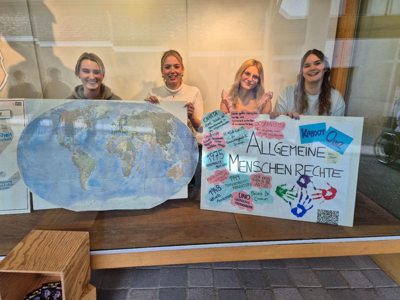 Wir als Gruppe hatten das Thema Menschenrechte Weltweit, dabei haben wir ein Schaufenster Plakat gestaltet und eine Nachrichtenshow vorbereitet. Es ging dabei um die wichtigsten präsentesten Themen wie Afghanistan, Gazastreifen und die Meinungsfreiheit in Russland. Ziel war es zu zeigen wie wichtig Menschenrechte für alle Menschen sind.